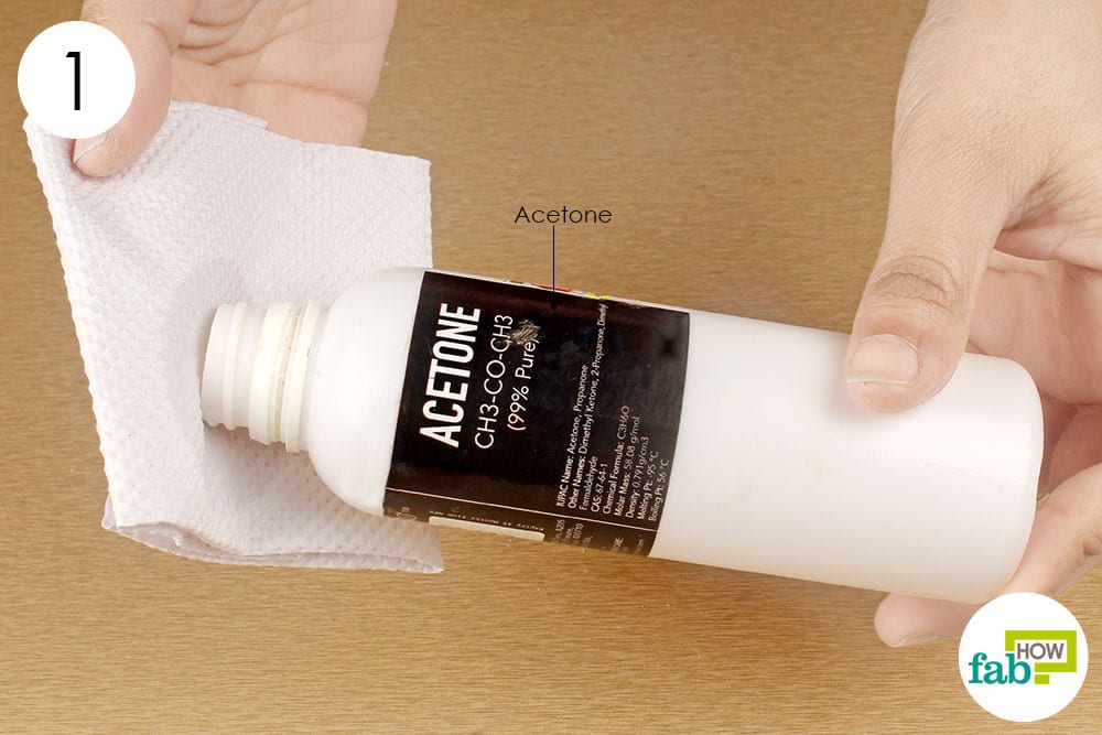 - Pour a liberal amount of acetone onto a folded paper towel so that it’s saturated.